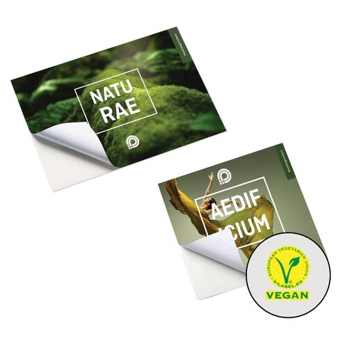 Auch mit dem gewählten Material setzen Sie Akzente. Es gibt viel mehr als Papier und Folie. Mit unseren veganen Aufklebern beispielsweise bieten wir eine Öko-Variante an, die aus umweltfreundlichen Materialien besteht. Verwendet werden ausschließlich mineralische, pflanzliche Inhaltstoffe und leimfreier Kleber auf Wasserbasis. Dank guter UV- und Temperaturbeständigkeit sind diese Sticker gut haltbar und können im Innen- sowie im Außenbereich eingesetzt werden.