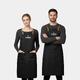 Schwarze Stoffschürze mit verstellbarem Nackenband und Taschen.