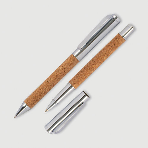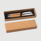 Schreibsets in Kork-Boxen bestehend aus Drehkugelschreiber mit Großraummine und einem Tintenroller mit Kork-Ummantelung