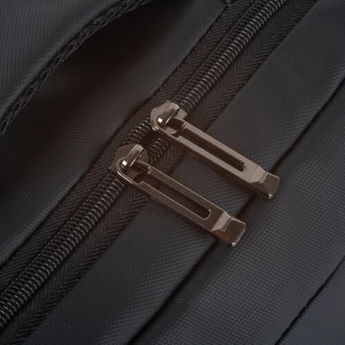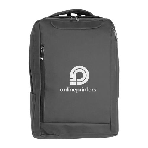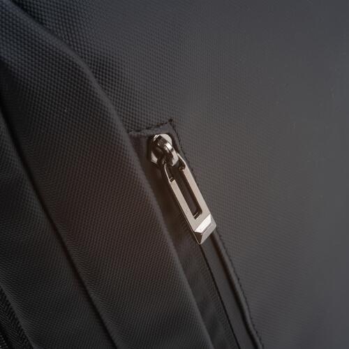 - Er verfügt über zwei Reißverschlussvorfächer, ein großes Hauptfach mit Polsterung für den Laptop, diverse Einsteckfächer innen, gepolsterte Schultergurte, einen Tragegriff sowie einen Gurt auf der Rückseite zum Befestigen am Trolley
