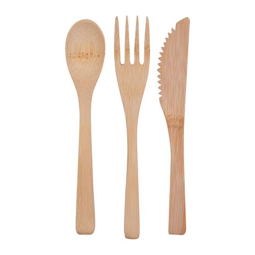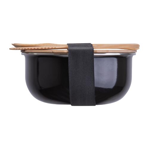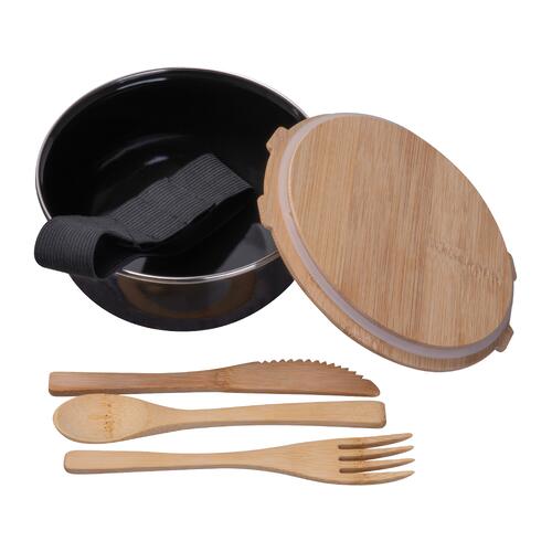 - Lunchbox (Fassungsvolumen 700 ml) aus Metall mit Bambusdeckel sowie einem Löffel, einer Gabel und einem Messer, ebenfalls aus Bambus