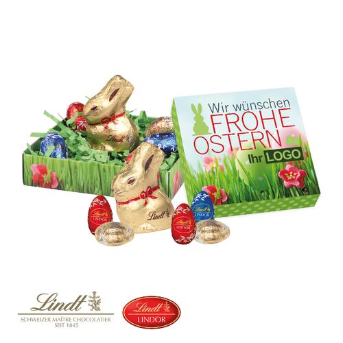- Schokoladenmischung (ca. 35 g), bestehend aus 5 Stück Schokoladen-Eiern, bunt gemischt und einem original Goldhasen von Lindt