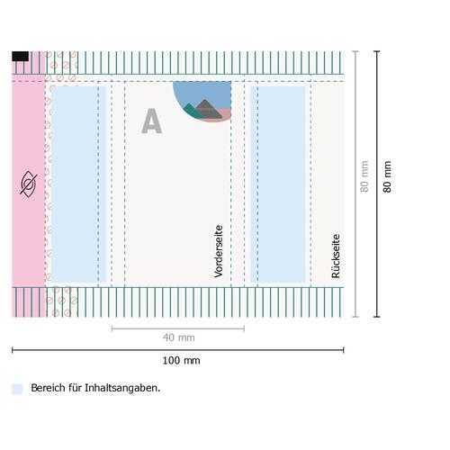 - Die gesetzlichen Pflichtangaben (Inhaltsangaben, Mindesthaltbarkeitsdatum, Hersteller/Inverkehrbringer etc.) werden im Rahmen des Produktionsprozesses automatisch eingefügt. Bitte beachten Sie die gekennzeichneten Bereiche im Datenblatt sowie in der Druckvorlage